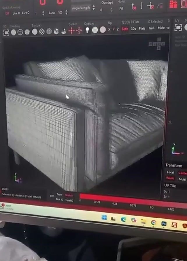 A computer screen displays a 3D model of a sofa in a software program. The model appears as a wireframe with a white grid overlaying the sofa’s shape, showing the mesh structure. The sofa includes cushions and armrests, and is positioned slightly angled in the view. The software interface is visible at the top of the screen with various options and tools. At the bottom, there’s a visible toolbar and a red-colored status bar. A hand covered with a plastic glove is partially visible in the lower left corner. A Toyota logo is on the bottom of the screen.