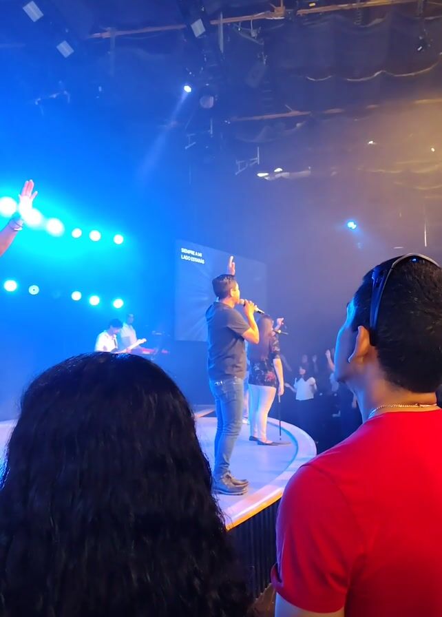 live musical performance on an elevated stage in front of an audience. The stage is bathed in vibrant blue lighting with a screen displaying lyrics behind the performers. A man in a dark shirt and jeans is singing into a microphone with his right arm raised, gesturing as he performs. To his right, a woman in a floral patterned blouse and light pants stands next to him, also holding a microphone. Other musicians are visible in the background, playing instruments. The audience is seen from the back of a few people. A person with curly black hair is in the lower left corner, and a man in a red t-shirt wearing headphones around his neck is in the lower right corner. This man is looking up at the stage. The overall impression is one of a vibrant and engaging live music performance.