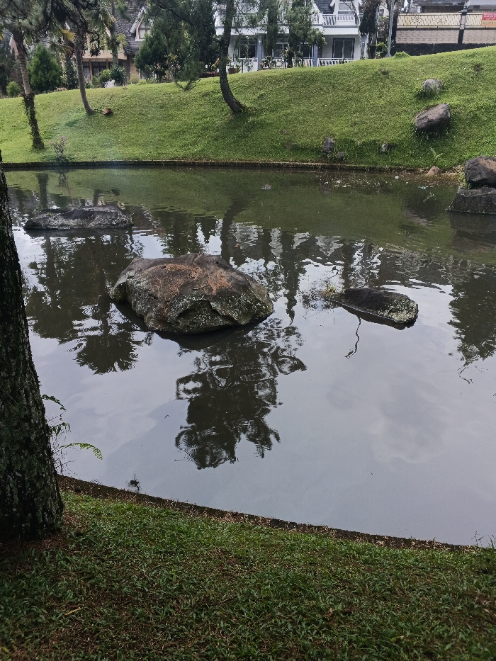 A tranquil scene of a pond nestled amidst lush greenery. Several large rocks dot the water's surface, partially submerged. Tree reflections create a mirror-like effect. A tree trunk and grassy bank frame the pond's edge in the foreground. A sloping green lawn rises in the background, adorned with trees and a building. The scene exudes a peaceful ambiance.