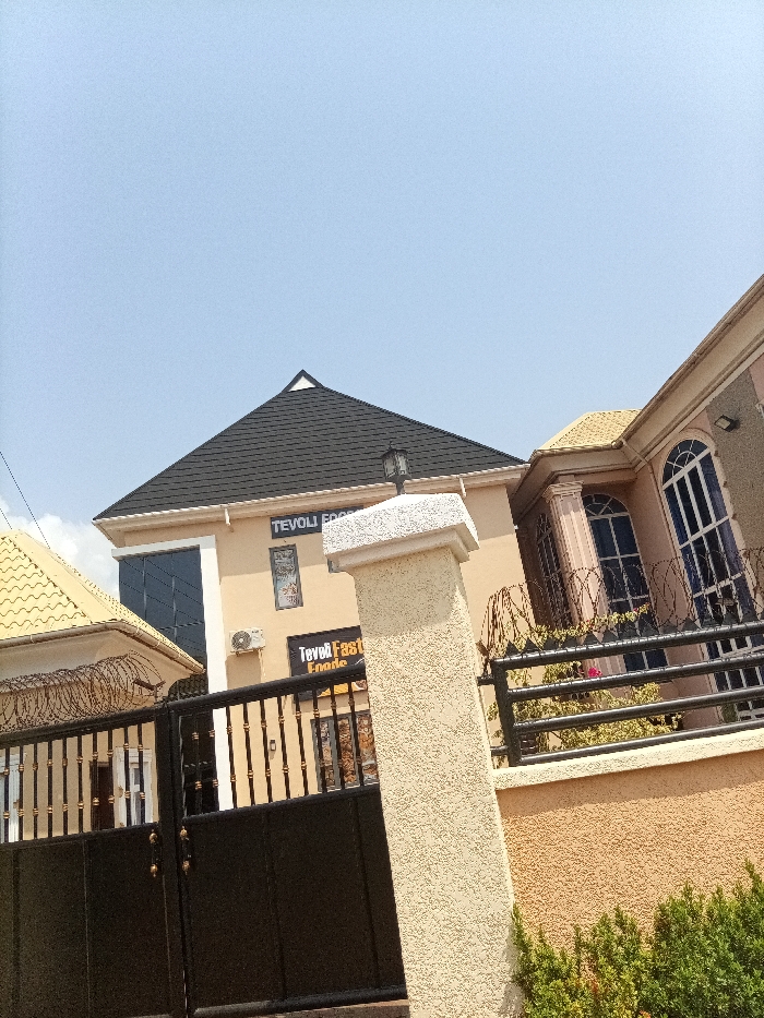 This image displays an outdoor daytime scene in Unknown, Unknown, featuring multiple buildings under a clear blue sky. A two-story, tan-colored commercial building, topped with a dark, pyramid-shaped roof, is centrally positioned. Its facade displays "TEVOLI EDGE" signage on the upper level and "Tevoli Fast Foods" on the lower level, with an air conditioning unit mounted between them. A prominent textured light-colored pillar with a dark lamp fixture on top stands in the central foreground, partially obscuring the lower portion of the "Tevoli Fast Foods" building. To the left, a light-colored building is secured by a dark metal gate topped with coiled barbed wire, behind which a light-colored hip roof is visible. To the right, a third tan-colored structure featuring columns, arched windows, and a light-colored hip roof is partially visible, also behind a dark fence topped with coiled barbed wire. Green foliage is present along the base of the rightmost fence and in the lower right foreground. No people or active interactions are depicted.