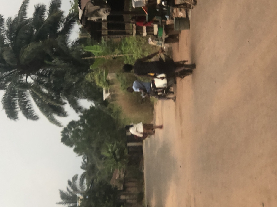 A road winds through a rural area with lush greenery and palm trees. A person walks on the side of the road, while a man drives a motorcycle with a passenger. Buildings line the road, and there appears to be activity around them. The sky is overcast, creating a subdued atmosphere.