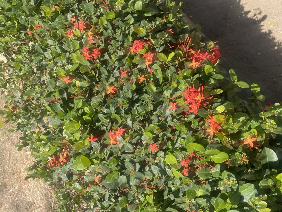 The image displays a dense, flowering shrub located in Tudun Nupawa, Nigeria. The shrub features numerous small, ovate, green leaves with a glossy appearance. Scattered throughout the foliage are multiple clusters of bright red-orange flowers, each typically possessing four distinct petals. Several elongated, reddish flower buds are also present. To the left and upper left of the shrub, dry, light brown ground with sparse, straw-like vegetation is visible. The lower right portion of the frame shows a darker, possibly dirt or paved surface, partially obscured by shadows originating from the shrub. No individuals or animals are present.