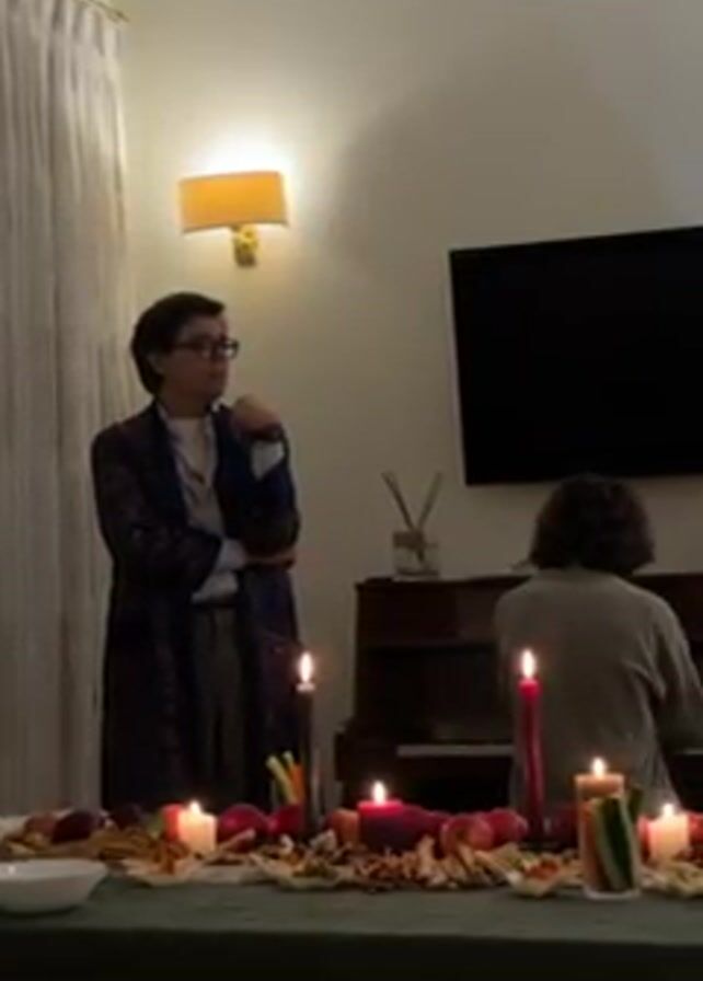 In a dimly lit indoor setting, the scene captures two individuals and a festive atmosphere. A person with short dark hair wearing glasses, a blue patterned robe over a white shirt and grey trousers, stands with their arms crossed, seemingly in contemplation. To their right, another person with curly dark hair sits at a piano, playing. A long table stretches across the foreground, adorned with a green tablecloth and numerous candles. These candles cast a warm, flickering glow on an assortment of fruits, vegetables, and snacks arranged as a decorative centerpiece. In the background, a dark piano sits against the wall, with a television screen above. A wall lamp illuminates the space, and partially visible curtains hang beside the man in the robe. The overall ambiance suggests a cozy, intimate gathering with a musical performance.