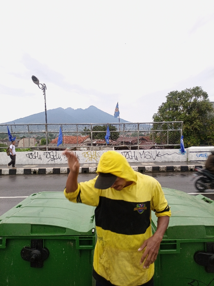 A man in a yellow and black hoodie stands next to a large green dumpster, waving his hand. Behind him is a bridge or overpass with graffiti and black and white striped sections. In the background, a mountain looms under a cloudy sky. Blue flags are placed along the overpass. A person walks on the sidewalk and a motorcycle drives by.