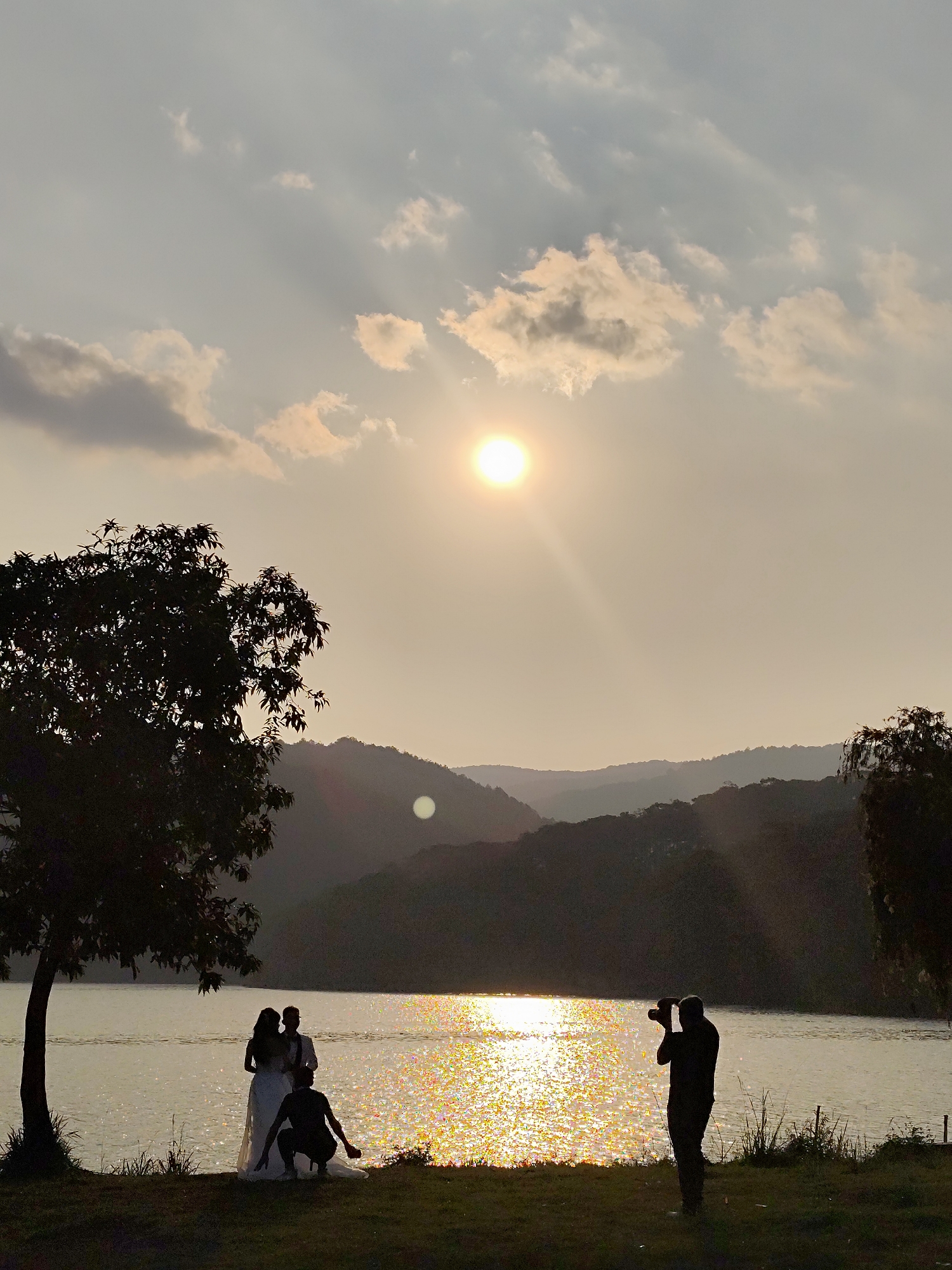 The image depicts a sunset scene at Tuyen Lam Lake in Da Lat, Vietnam. The sky is illuminated by a bright, round sun positioned slightly left of center, casting rays through scattered clouds and across a hazy atmosphere. Layers of dark, forested mountains form the distant background silhouette. A large body of water, the lake, occupies the middle ground, with the sun's reflection creating a shimmering, golden-orange path across its surface towards the right. In the foreground, a grassy bank slopes gently to the water's edge. A dark, silhouetted tree stands on the left. Four human figures are present, also largely silhouetted against the bright water and sky. On the left, near the tree, a couple stands, presumably a bride in a light-colored gown and a groom in formal wear. A third figure is crouched in front of them, possibly an assistant or another photographer. To the right, a fourth individual stands, holding a camera with a lens pointed directly at the couple, indicating an active photoshoot. The scene captures a professional photography session during the golden hour.