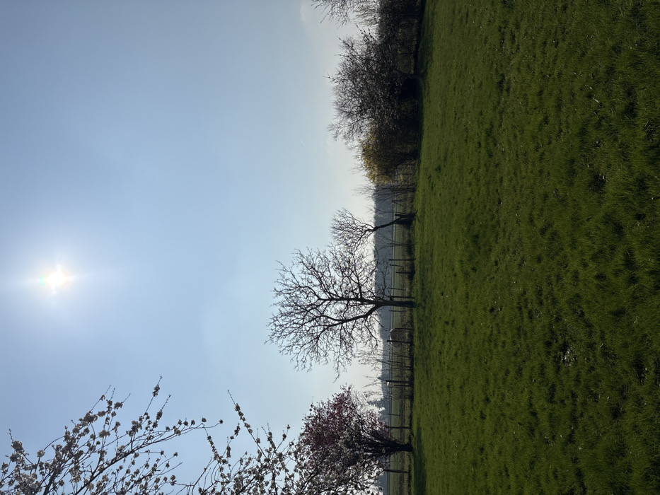 The image displays a rural outdoor scene in Bû, France, under a clear, bright blue sky with the sun prominently visible in the upper-left quadrant, creating a lens flare. The foreground consists of an expansive, vibrant green grassy field. A wire fence with vertical wooden posts extends horizontally across the midground. Behind this fence, from left to right, are several trees and shrubs: a tree with reddish-pink blossoms, a large deciduous tree with bare branches, and a smaller, leaning deciduous tree also with bare branches. To the right, a dense bush exhibits yellow flowers, accompanied by other leafless shrubs and trees. A light-colored animal, consistent with a sheep, is partially obscured behind the fence in the mid-left area. In the distant background, a faint horizontal line of trees marks the horizon. Partially visible in the upper-left is a tree branch adorned with white or light pink blossoms.