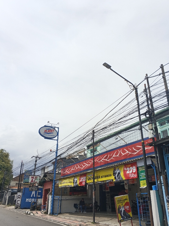A street scene with cluttered overhead power lines. A store with a red and yellow awning advertising "LEBIH LAMA BOTAKNYA" (longer baldness) for 239,000. A sign for "PLANET COOL" for car air conditioning repair is visible. Several people are sitting in front of the store. A streetlight and a blue and white sign are also present. The sky is overcast.