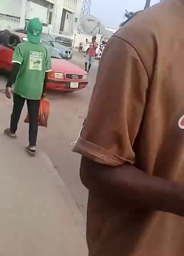 street scene, possibly in Nigeria, with several people walking, vehicles parked and moving in the background, and a street vendor selling goods under a large umbrella. People are dressed in various casual attires. The street surface appears to be asphalt with some litter. Buildings are visible in the background, and overhead power lines are present. The overall impression is of a busy, everyday street scene in a developing urban area.