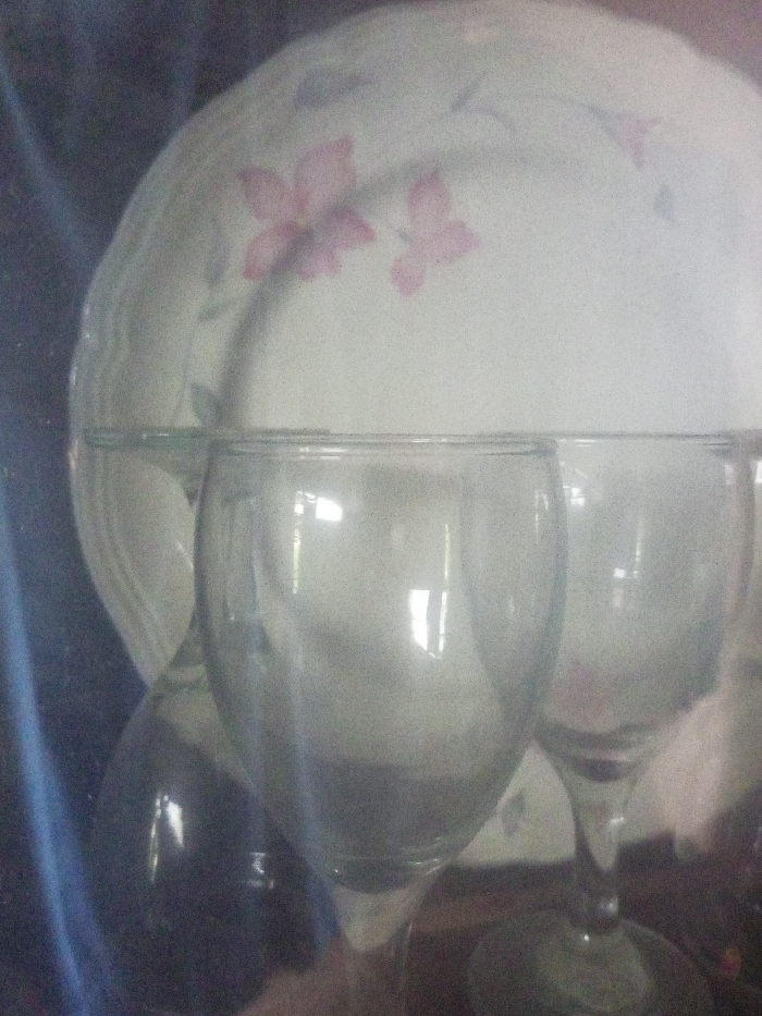 A white plate adorned with light pink floral designs serves as a backdrop for three clear wine glasses. Two glasses stand prominently in the foreground, their shapes suggesting a narrow bowl and a thin stem. The third glass is partially obscured, hinting at its position behind the others. Light reflects off the glasses, creating highlights and depth within the composition. The scene appears to be captured behind a slightly foggy or textured surface.