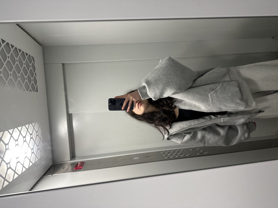 The image depicts an individual taking a mirror selfie inside an elevator. The subject, a person with dark, wavy hair, is observed from the mid-thigh up, dressed in a black undershirt, an oversized light gray zip-up hoodie with two large front pockets, and light gray casual trousers. A dark-colored smartphone is held in the right hand, obscuring the upper portion of the subject's face. The elevator interior consists of light gray or white panels. A vertical control panel on the left wall features multiple circular buttons and a red digital display. The ceiling contains two rectangular light fixtures with a patterned grille. No specific identifiers for a precise location within Yerevan, Armenia, are present in the image.