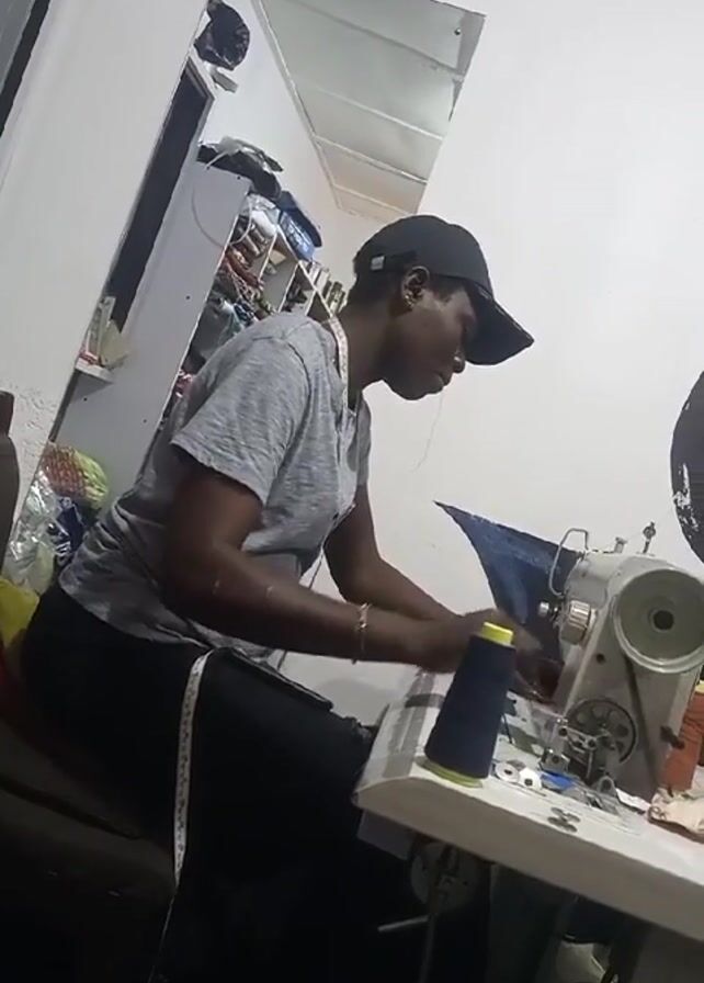 A woman with dark skin, wearing a gray t-shirt and black pants with a measuring tape draped around her neck, sits at a white sewing machine. She is wearing a black baseball cap. She appears to be sewing a piece of blue fabric. There is a spool of blue thread on the table next to the machine, along with a pair of scissors and various sewing supplies. The room is small and has a mirror on the wall, reflecting clothes on a shelf. The wall is painted white and has a blue semi-circle design.