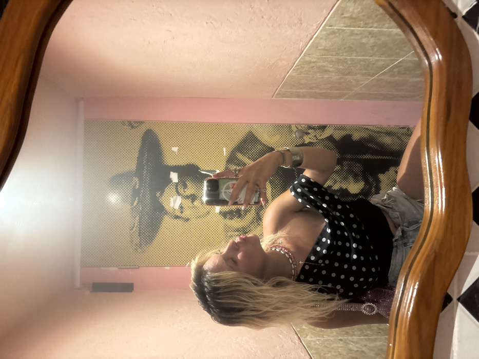 A female subject is depicted in a mirror selfie within an indoor setting in Pecatu, Indonesia. She has shoulder-length blonde, wavy hair with darker roots and is posing with pursed lips. She wears a black, one-shoulder top with white polka dots, and light-wash denim shorts. Her accessories include a red beaded necklace, a white necklace, a small cross pendant, multiple rings on her left hand, and a wide silver cuff bracelet on her right wrist. She holds a light-colored smartphone with stickers in her right hand to capture the image. A small, sparkling pink handbag with a circular buckle hangs from her left shoulder. The mirror is framed at the bottom by dark brown, carved wood. The background, visible in the mirror's reflection, consists of a door adorned with a large black and yellow pop-art graphic featuring a person in a wide-brimmed hat, overlaid with a halftone dot pattern. The visible room features light pink walls above a section of beige tiles. The floor visible in the reflection is composed of black and white checkered tiles.