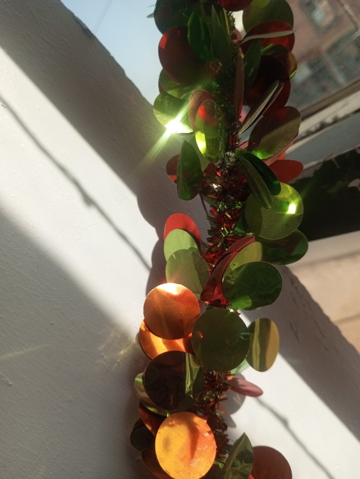 An indoor scene in Gura Top, Nigeria, features a vertical decorative garland positioned on the right side of the frame, illuminated by direct sunlight