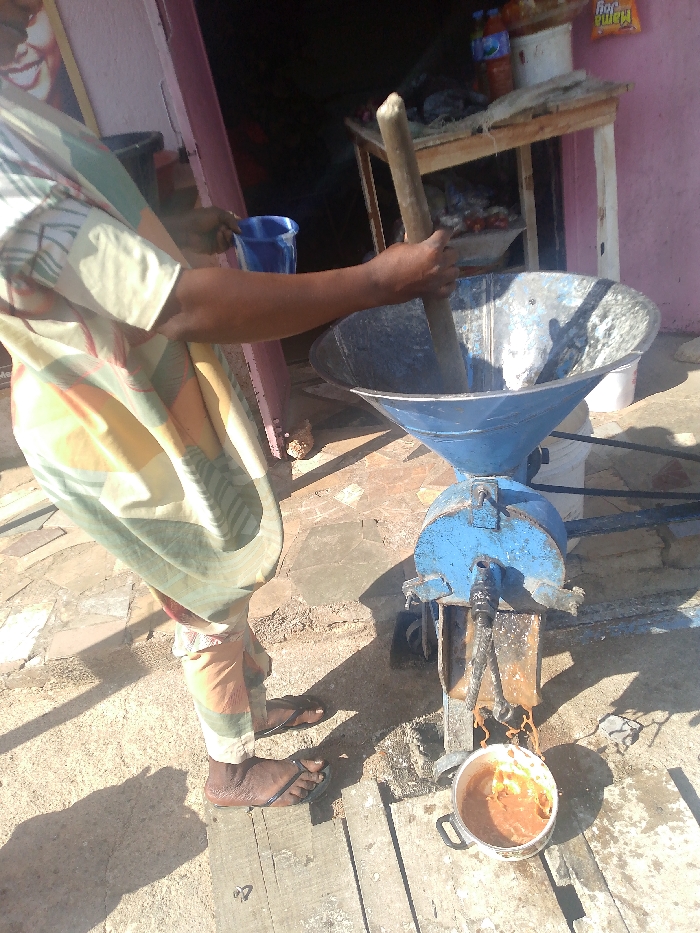 The image displays an outdoor scene in what appears to be an urban or semi-urban environment in Nigeria, consistent with settings found in cities like Jos. A specific location within Jos cannot be determined from the visual evidence provided. In the foreground, an individual is partially visible from the mid-torso to the feet, engaged in operating a blue mechanical grinding machine. The individual wears a multi-colored patterned tunic over light-colored trousers and black flip-flops. Their right hand holds a long, rough-hewn wooden pestle, which is positioned within the machine's large, conical metal hopper, indicating agitation or feeding of material. Their left hand holds a small blue plastic cup, suggesting the addition of a liquid or small quantity of ingredient. The grinding machine itself is a robust, blue-painted apparatus featuring a wide, funnel-shaped metal hopper at the top. From a spout at the machine's lower section, a reddish-orange, viscous paste is being expelled. This processed material collects in a silver-colored metal pot with a black handle, positioned directly beneath the spout. The pot is partially filled with the paste. The background consists of a building with a light pink exterior wall. An open doorway reveals a dimly lit interior containing shelves or tables laden with various items, including bottles and containers. To the right, within the doorway, a small wooden table holds bottles, a white bucket, and a yellow package identified as 'Mama Joy'. The ground is an uneven surface comprising both concrete and irregularly shaped paving stones, illuminated by strong sunlight which casts distinct shadows.