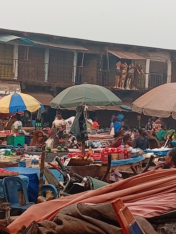 - "The image displays an active outdoor market in Nsukka, Nigeria, characterized by numerous vendor stalls and a multi-story building in the background, all under an overcast sky" by FM-ANy5a2, licensed under CC BY 4.0