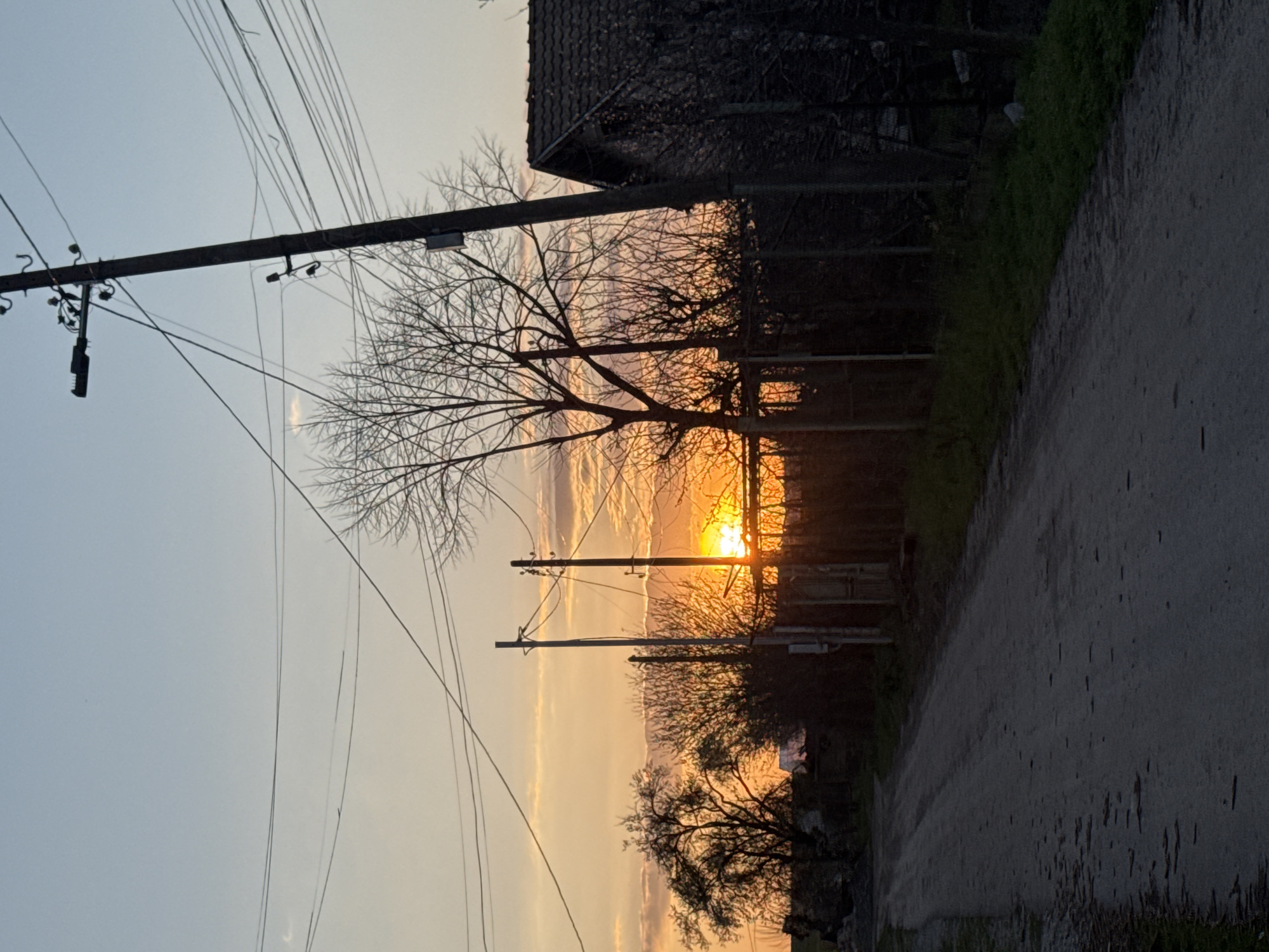The image depicts a rural or semi-rural lane in Polikraishte, Bulgaria, at sunset. A dirt or gravel road occupies the lower portion of the frame, appearing dark in the foreground and curving slightly to the left as it recedes into the distance. Sparse green grass borders the road on both sides. The sky dominates the upper half, transitioning from light blue at the zenith to vibrant orange and yellow hues near the horizon, where the setting sun is prominently visible as a bright, circular disc. The sun is partially obscured by a dense silhouette of bare deciduous trees and bushes, consistent with late winter or early spring. Multiple utility poles with numerous overhead power and communication lines run along the right side of the road, silhouetted against the sky. The closest pole on the right features a street light fixture. A dark, tiled-roof building, partially obscured by a utility pole and bare vegetation, is visible on the far right. Fencing is present along the right side, running parallel to the road. No individuals or vehicles are visible in the scene.