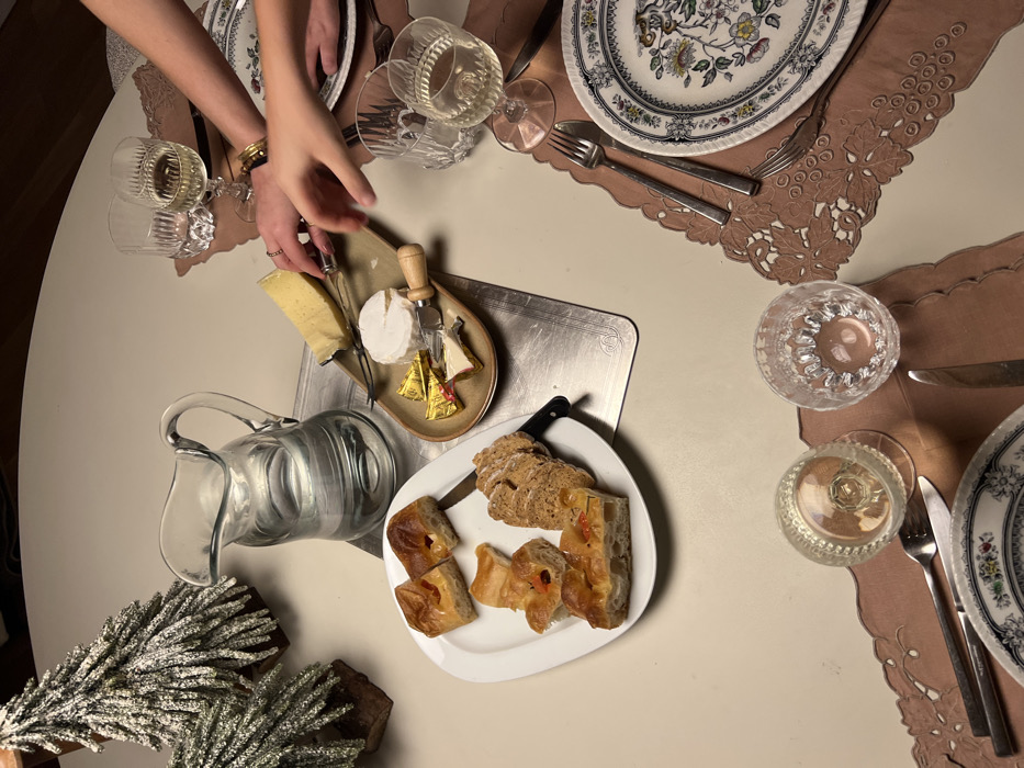A dining table is set for a meal, featuring floral-patterned plates on ornate placemats, accompanied by silverware and crystal glassware. A cheese board with various cheeses and a knife, along with a plate of bread, sits nearby. A glass pitcher is also visible. A person's hand reaches for the cheese board. A decorative faux evergreen branch rests near the edge of the table.