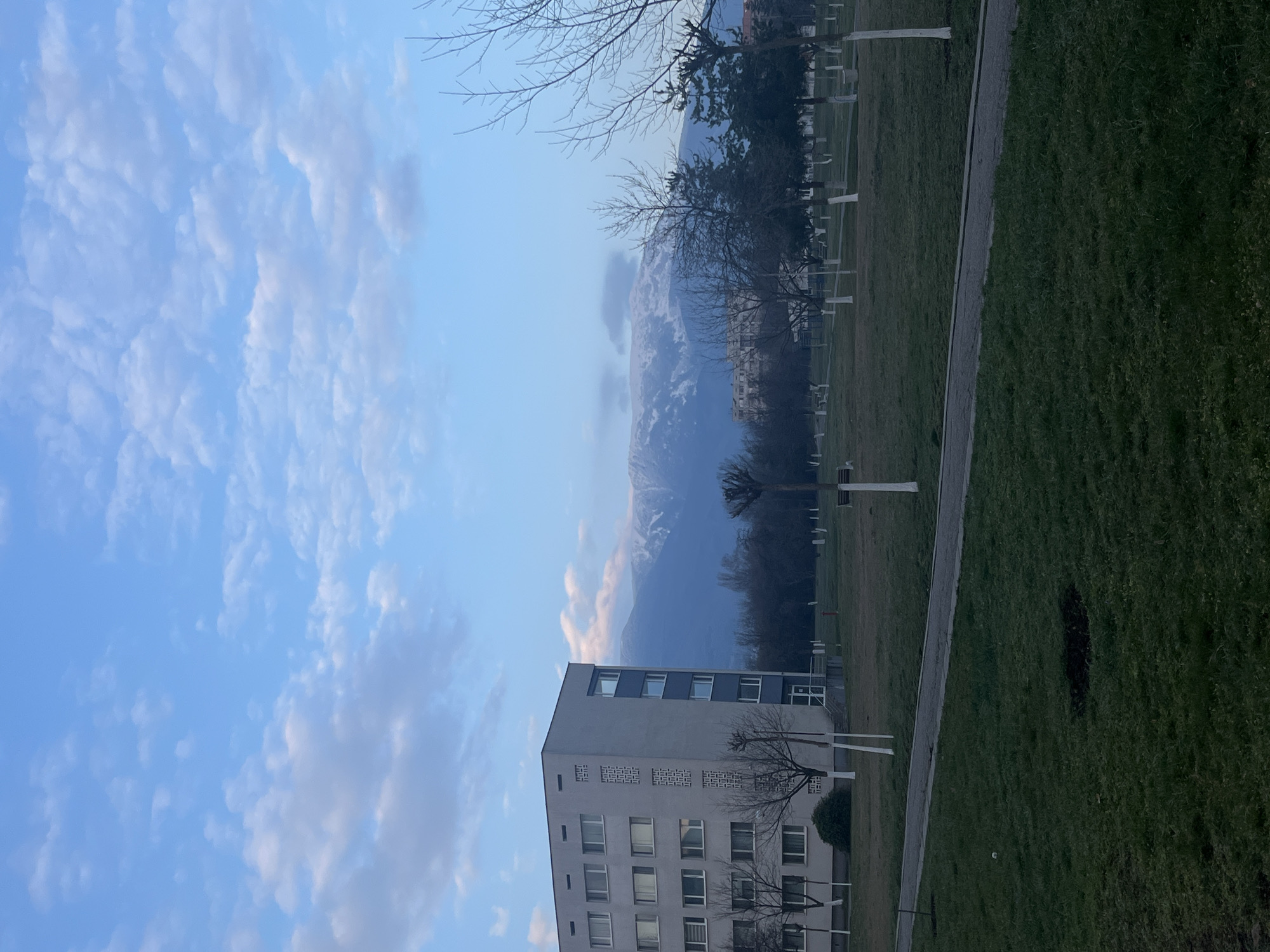 The image displays an outdoor scene in Sofia, Bulgaria, looking towards the Vitosha mountain range. In the foreground and midground, a wide expanse of unmaintained green grass is visible, featuring numerous leafless deciduous trees with white-painted lower trunks. A dark gray paved pathway traverses the lower half of the image, diagonally from left to right. A small, dark, circular depression in the grass is present in the lower center. On the left side, a five-story, light gray brutalist-style building stands prominently, characterized by multiple rectangular windows with white frames and a geometric pattern relief on one facade. A red fire hydrant is situated near the building's right side. In the background, partially obscured by clouds, snow-capped mountains of the Vitosha range are visible under a partly cloudy blue sky. Several other buildings are faintly visible through the trees in the distance. No individuals or discernible actions are depicted. The scene suggests a park or campus area within the city, likely the Studentski Grad district, during a temperate or cold season.