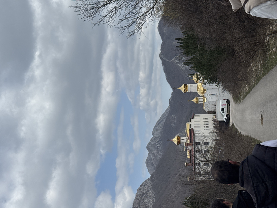 The image depicts an outdoor scene near Čeluga, Montenegro, focusing on a religious complex against a mountainous backdrop. In the foreground, a dirt or gravel pathway curves slightly to the right, leading towards the structures. The backs of three individuals are partially visible: on the left, a person with dark hair wearing a dark vest; in the center, a person with dark hair and glasses wearing a dark vest over a white shirt; and on the far right, a partial view of a person's right shoulder in a light-colored top. The midground is dominated by a white building complex, consistent with an Eastern Orthodox monastery or church, featuring prominent golden onion domes. The main complex consists of a multi-story white building with a reddish-brown roof and at least three golden domes. To its right stands a distinct, smaller white church building with a similar roof and five golden onion domes. A white commercial van with a red or pink logo on its side is parked on a paved section to the left of the smaller church. The path and surroundings are lined with sparse, predominantly deciduous vegetation with bare branches, suggesting late winter or early spring. Some evergreen trees are visible closer to the complex. In the background, a range of grey, rocky mountains extends across the horizon, appearing sparsely vegetated. The sky above is partially cloudy, with large grey and white clouds interspersed with areas of light blue. The scene is illuminated by diffused daylight, indicating overcast conditions.