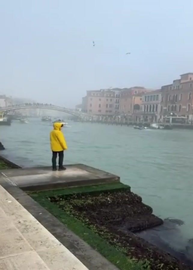 person wearing a yellow raincoat standing on a concrete platform overlooking a canal in Venice, Italy