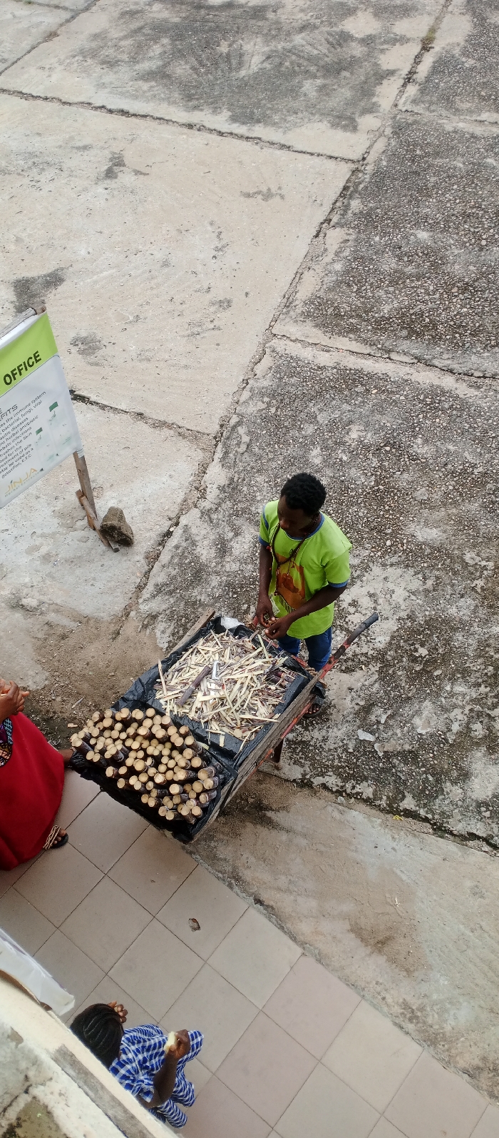 The image displays an outdoor scene located in Lokoja, Nigeria, captured from an elevated perspective. A male vendor with dark, braided hair, wearing a lime-green t-shirt with blue trim and dark pants, stands behind a red-framed wooden wheelbarrow. He is actively engaged with the contents, his hands positioned over sugarcane stalks and peelings. The wheelbarrow is divided internally by a black liner. The left compartment (from the viewer's left) contains a uniform stack of numerous short, light-brown segments of peeled sugarcane. The right compartment holds a larger quantity of pale yellow sugarcane peelings and several unprocessed sugarcane stalks, with a small, reflective metal peeler or knife visible among them. To the immediate left of the wheelbarrow, partially visible on a light-colored tiled surface, is an individual in a red garment and sandals, positioned to interact with the vendor. Further into the foreground on the tiled surface, another individual, wearing a blue and white checkered garment, holds a light-colored item to their mouth. The ground surrounding the wheelbarrow and vendor is a rough, stained concrete surface, exhibiting cracks and variations in texture and color, ranging from light grey to dark, wet-looking patches. The tiled floor in the foreground transitions abruptly to this concrete area. In the upper-left quadrant, a white sign with green accents and the prominent word "OFFICE" is displayed on wooden supports, stabilized at its base by a rock. The sign lists "BENEFITS" below the title, detailing multiple points of information.