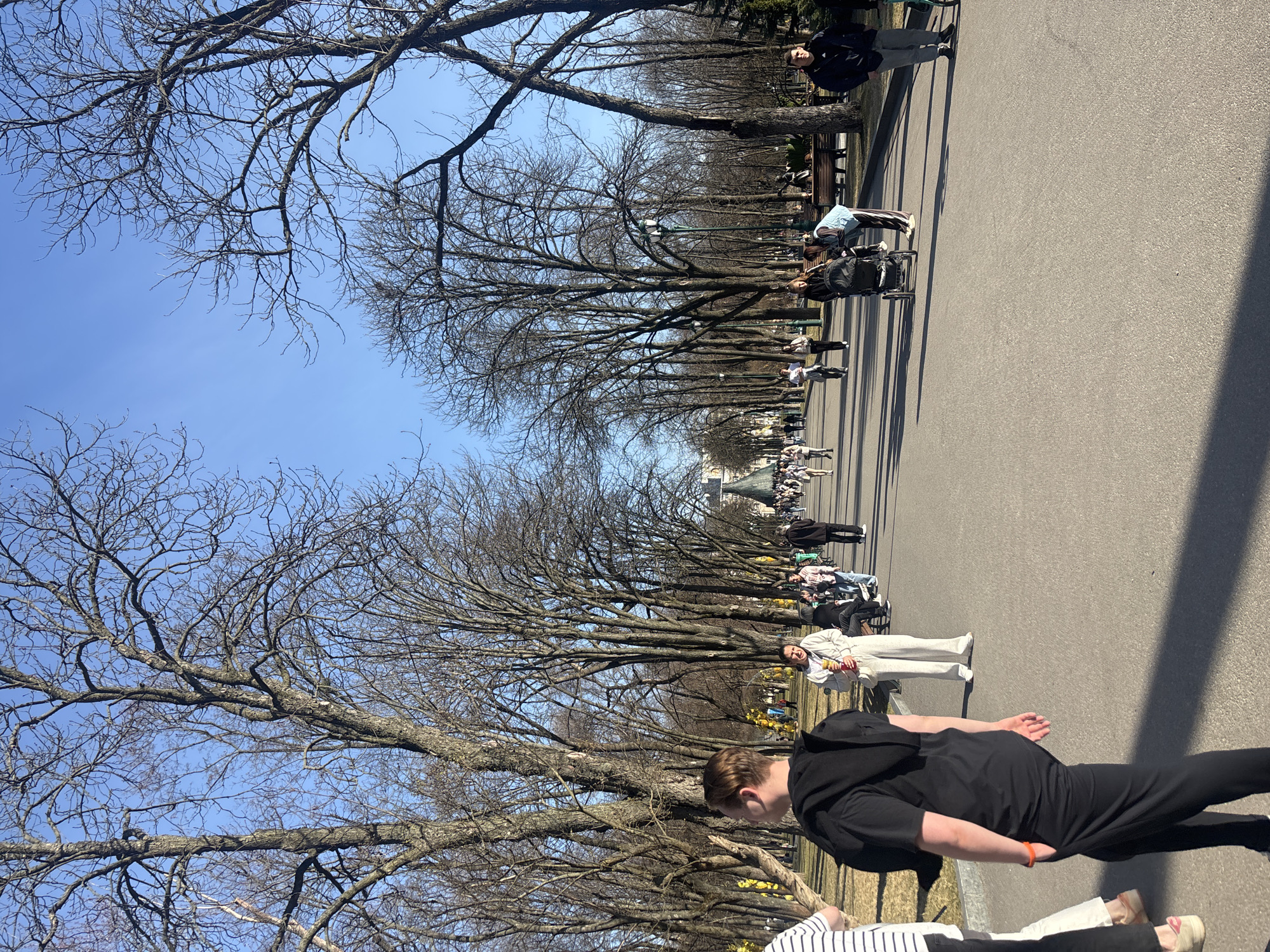 tree-lined pedestrian walkway in Kharkiv, Ukraine. The trees are mostly bare, indicating it is likely early spring or late autumn. People are walking and sitting along the walkway. The sky is clear and blue. In the background are buildings, possibly government or historical structures. The scene appears to be taken in a park or a recreational area in the city.