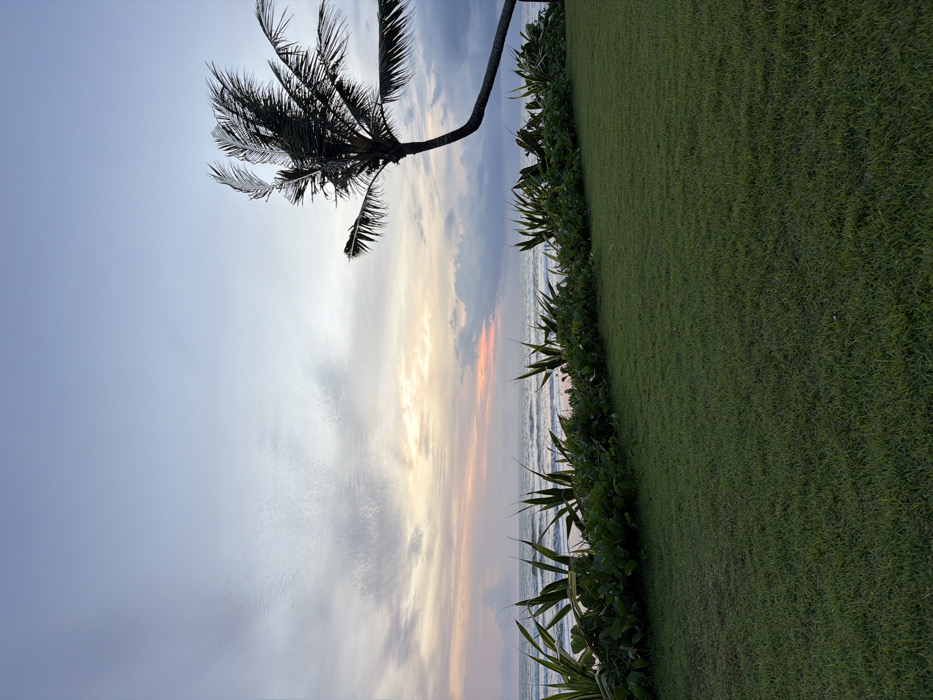 The image displays a coastal landscape in Belalang, Indonesia, during twilight. The foreground presents a uniformly green, short-cut lawn. A distinct horizontal band of dense green foliage, consisting of both spiky and broad-leafed plants, separates the lawn from the ocean. The ocean surface exhibits white-capped waves breaking towards the visible sandy shore. The sky, occupying the upper two-thirds, transitions from pale orange and pink hues at the horizon line to a soft blue-grey, marked by scattered clouds. A single palm tree, characterized by a dark, curved trunk and wind-blown fronds, is silhouetted on the right side of the frame. No individuals, animals, or artificial objects are present. The scene is static, illuminated by natural light.