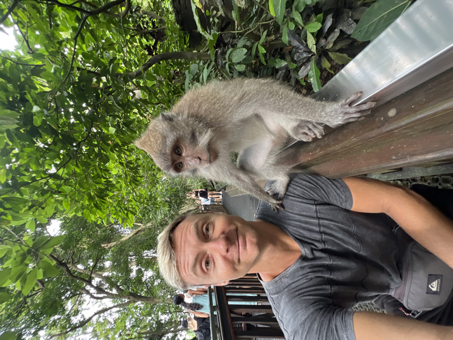 - "A male individual and an adult long-tailed macaque are captured in a selfie at the Sacred Monkey Forest Sanctuary in Ubud, Bali, Indonesia" by FM-xgQP92, licensed under CC BY 4.0