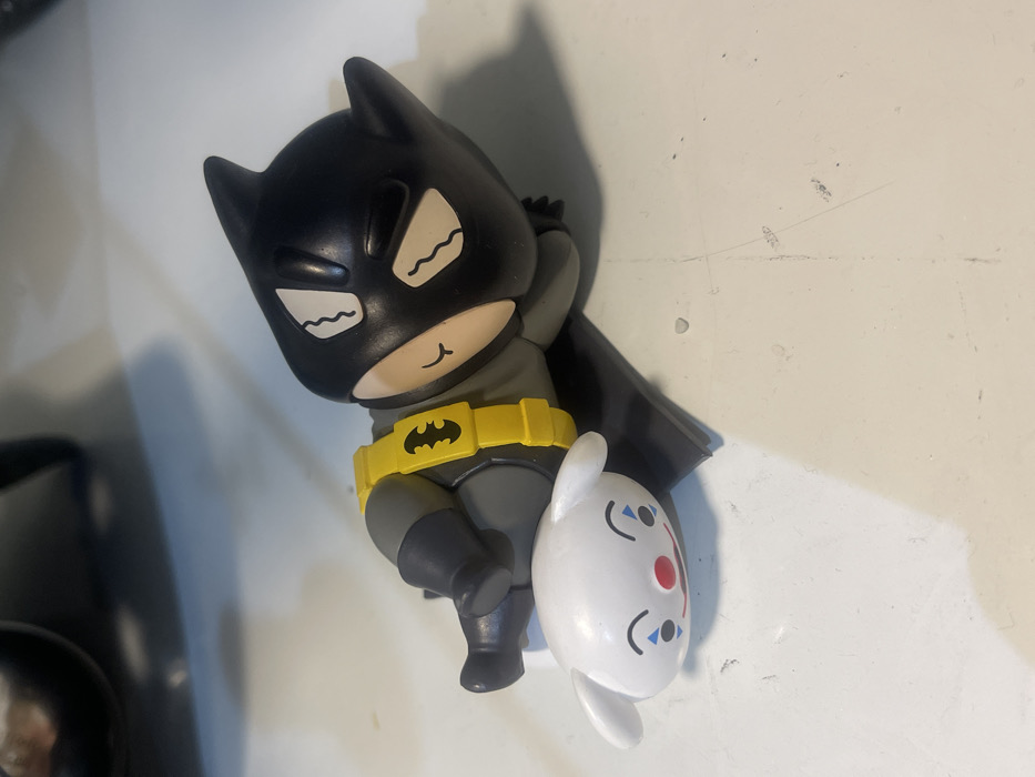 The scene displays two collectible figurines on a light-colored, slightly scuffed flat surface, consistent with a tabletop. A stylized Batman figure, dressed in a grey suit, black cowl, and yellow utility belt with a black bat emblem, is positioned lying on its left side. Its head, featuring closed eyes with wavy white lines and a light flesh tone for the exposed face, rests on a smaller, white figure. This subordinate figure possesses a rounded head with small ears, a red nose, and blue triangular marks below each eye, giving it a clown-like or rabbit-like appearance. The Batman figure's black cape is visible beneath its body. A blurred dark object is partially visible in the upper left background. No visual cues within the image allow for the identification of a specific location in the city of Bangkok, Thailand.