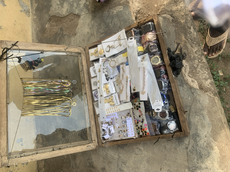 An open, weathered wooden display case with a glass lid, containing various jewelry and accessories, rests on a cracked concrete surface in Umuode, Nigeria
