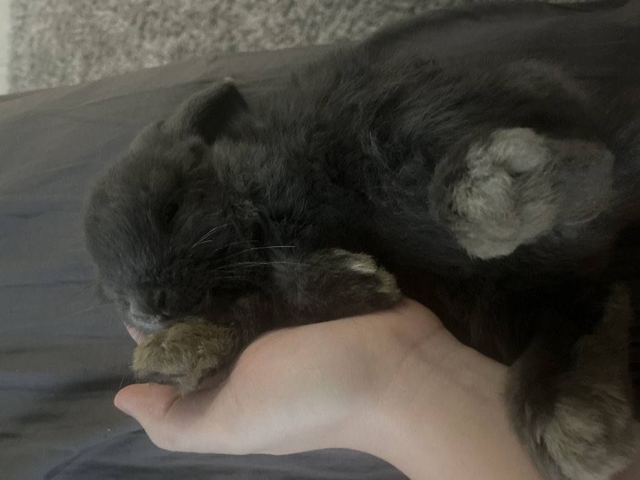 In the city of Turin, Italy, a fair-skinned human left hand is observed gently cradling the head and forepaws of a small, dark gray-furred animal. The animal, consistent with a domestic rabbit, is positioned supine or on its side, with its body partially visible. Its fur is predominantly dark gray, with lighter gray and brown coloration present on its paws. White whiskers are distinct around its snout, which is partially obscured by its own forepaw held by the human hand. The interaction signifies a still and calm engagement. The immediate environment consists of a dark, indistinct fabric surface to the left of the frame and a lighter, textured, possibly carpeted surface to the right.