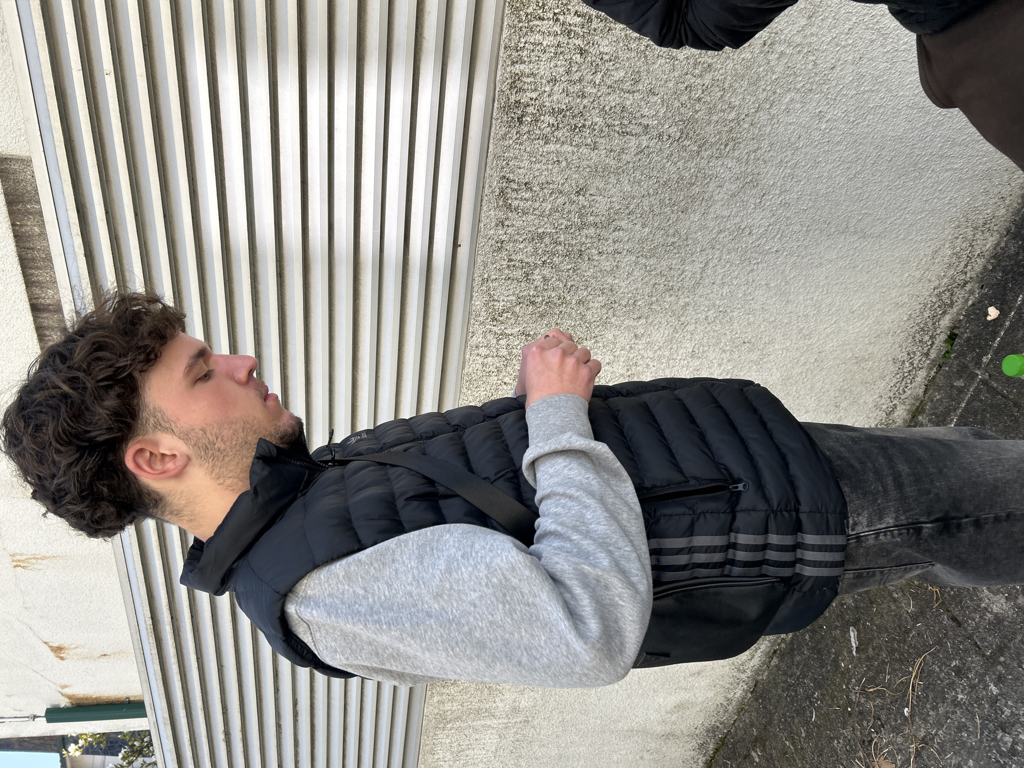The image captures a young male standing outdoors in Vila Real, Portugal. He is depicted from the waist up, looking downwards and slightly to his left. He wears a grey long-sleeved sweatshirt, a black padded vest featuring three dark vertical stripes on its lower left side, and dark grey jeans. A black strap, likely from a shoulder bag, crosses his upper body. His hands are clasped or holding a small, indistinct item directly in front of him. A second individual is partially visible in the bottom right, wearing dark attire. The background consists of a light-colored building wall; its upper section is overlaid with horizontal, light-toned slats, below which is a textured, greyish-white rendered surface. The ground is dark grey, possibly concrete or asphalt, with scattered dry debris, a small green bottle cap, and a light-colored piece of litter. Green foliage is visible in the far upper-left background.