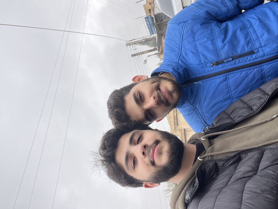 Two young adult males are depicted in a close-up photograph taken outdoors on an overcast day in At-Tall, Syria