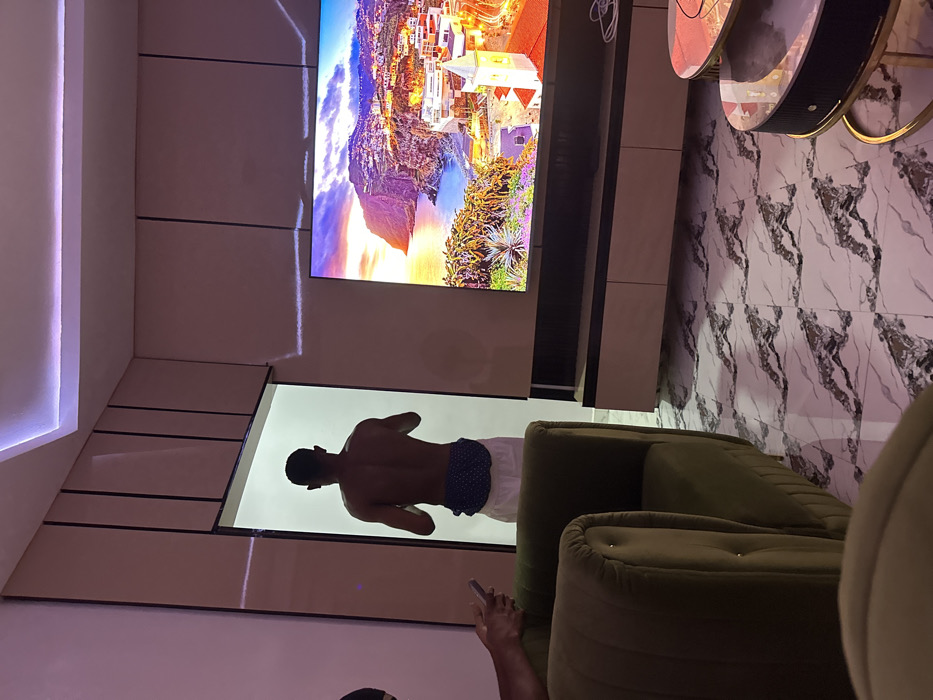 Inside a contemporary living room, a shirtless man wearing shorts is reflected in a glass panel beneath a large, vibrant television screen. An olive-green armchair sits nearby, partially obscuring the man's reflection. The room features modern, paneled walls and a marble-patterned floor. A multi-tiered round table with metallic accents is positioned in the upper right corner of the frame. The composition is captured from a slightly low angle.