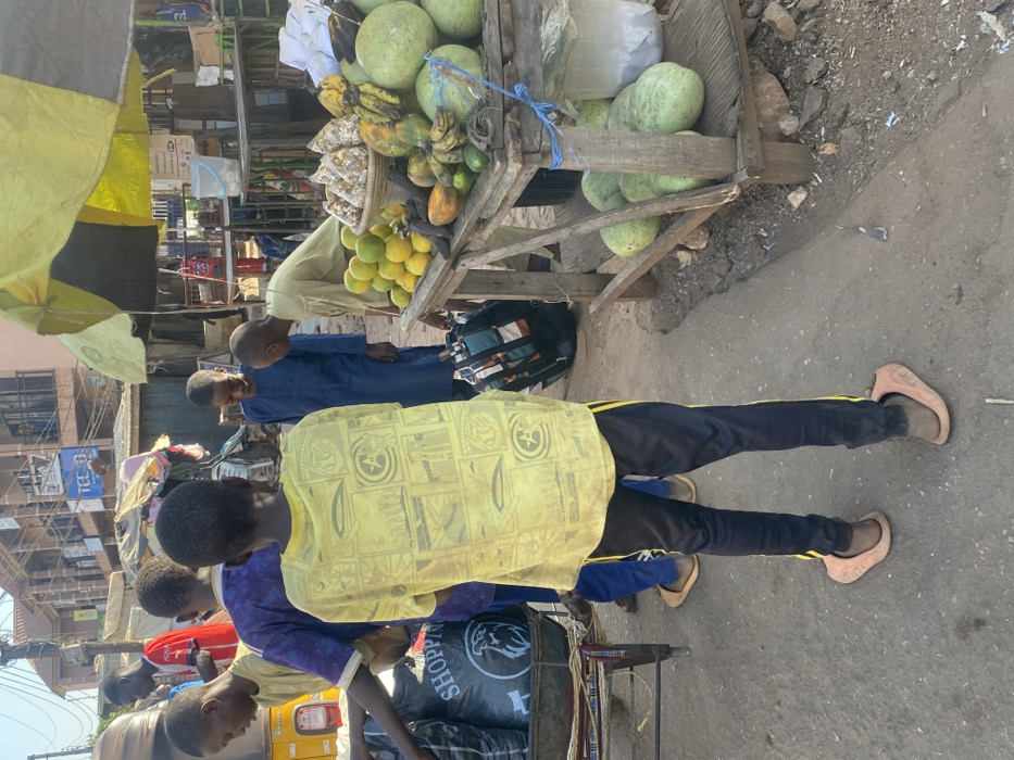 The image captures a bustling outdoor market scene in Kaduna South, Nigeria, under bright daylight. In the foreground, a young male stands with his back to the camera, wearing a light yellow short-sleeved t-shirt adorned with dark grey graphic patterns, black track pants with vertical yellow stripes, and light brown, rounded slip-on sandals. To the immediate right of this central figure, a young male in a long-sleeved blue traditional garment stands facing left. Further to the right, an adult male in a light-colored traditional long-sleeved top leans forward, attending to a two-tiered wooden fruit stall. The upper tier of the stall displays a large quantity of bright oranges, several ripe bananas, two papayas, small green fruits (possibly limes), and two conical, clear plastic bags filled with what appear to be light-colored snacks or groundnuts. The lower tier holds several large, light green, spherical fruits resembling watermelons or gourds, alongside a white plastic bucket secured with blue cord, containing ice or a solid white substance. A large, light yellow and black market umbrella provides shade over this stall. On the left side of the frame, another young male in a light-colored shirt is visible, interacting with items on a hand-drawn cart that holds a black bag marked "SHOPPING" with a white logo. A yellow auto-rickshaw (Keke Napep) is partially visible behind him. A dark-colored backpack with a colorful strap rests on the ground near the fruit stall. The background features several multi-story buildings, some with exposed brickwork, and visible overhead electrical wiring. A blue sign with the text "TEC" is discernible on one building. The ground is an uneven asphalt surface with patches of exposed dirt and gravel. Multiple other individuals are present in the midground and background, suggesting a busy commercial thoroughfare.