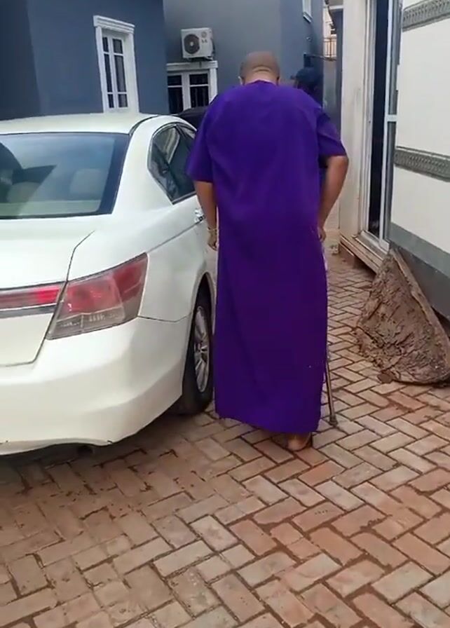 man from the back, wearing a purple robe and using a cane. He is walking on a brick paved surface, next to a white car and a white trailer. A second man is visible further in the background, wearing a blue shirt. The scene appears to be in a residential area, with houses in the background.