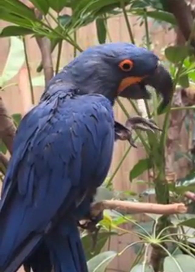 A blue Hyacinth Macaw perches on a branch amidst lush green foliage. The parrot meticulously grooms its foot with its beak. The bird has vibrant orange eyes and a black beak. The surrounding greenery adds to the natural setting.