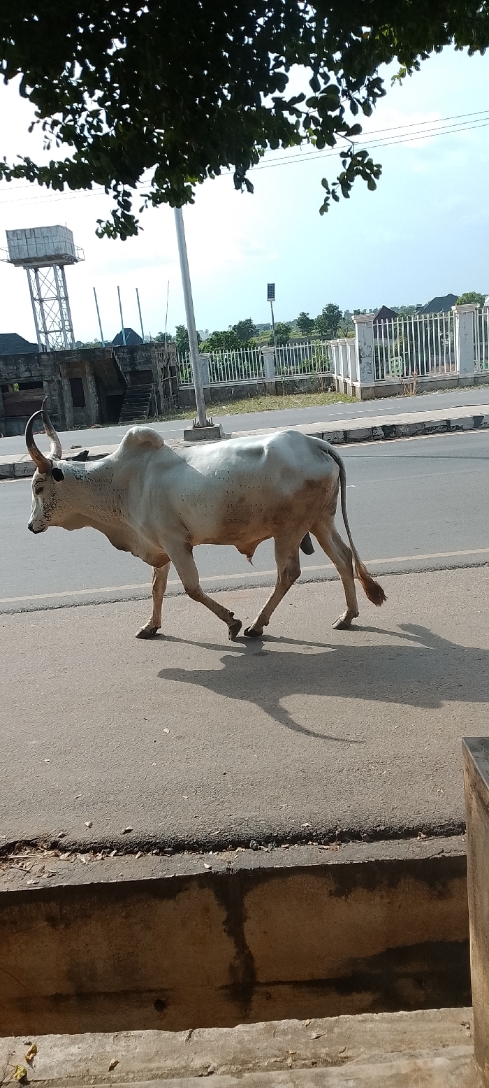 - "The image depicts a white Zebu bull traversing an asphalt road in Lokoja, Nigeria, under a clear sky" by FM-OxCpB3, licensed under CC BY 4.0