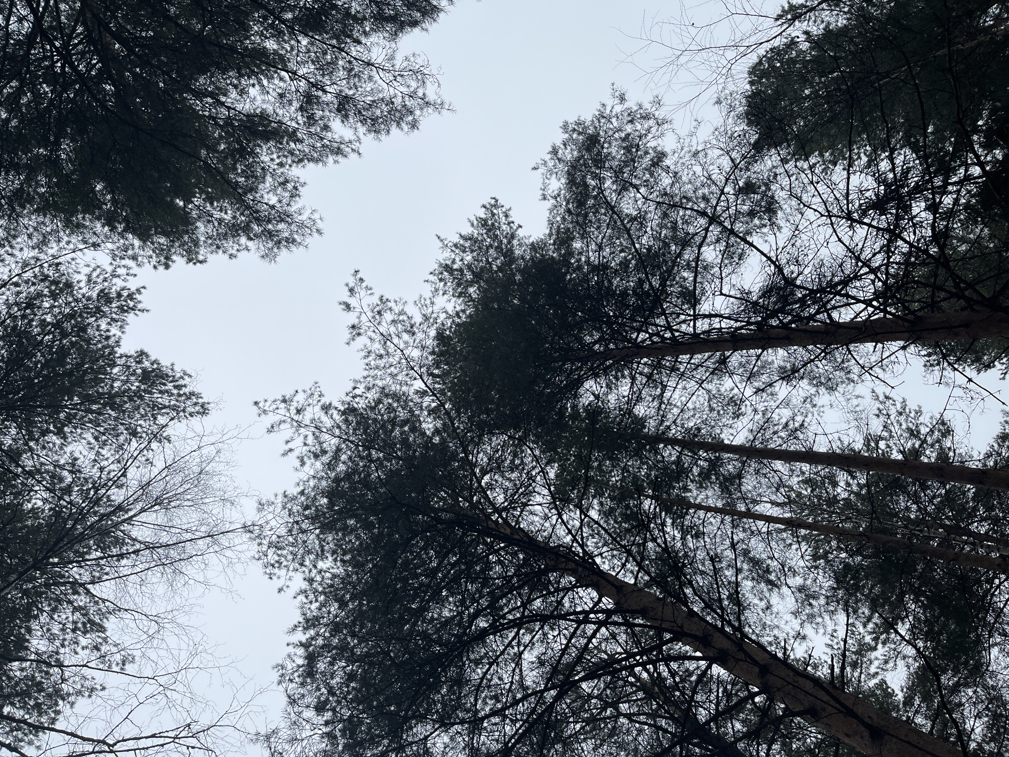 The image depicts a view looking upwards through a canopy of trees against a light, overcast sky