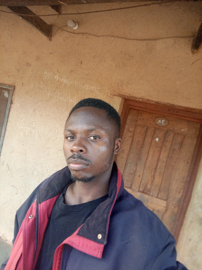 A man with dark skin and short hair is centered in the frame. He wears a dark t-shirt and a navy jacket with a maroon lining. His gaze is directed towards the camera. Behind him, a textured, light brown wall provides the background. To the right, a wooden door with a small number plate adds depth. Above, a light fixture is visible against the wall's surface. The setting appears to be outdoors, possibly near a building's exterior.