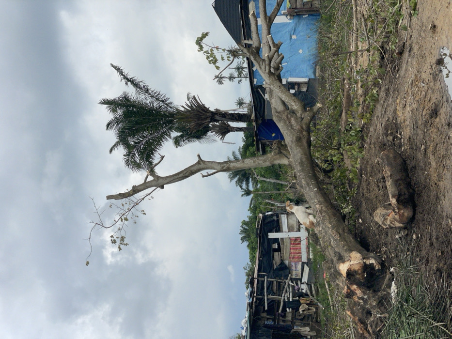 The image depicts a rural or semi-urban scene in Badore, Nigeria, under an overcast sky. A large tree, predominantly light brown-grey, lies horizontally across the mid-ground, extending from the lower-left to the middle-right. The tree has been partially cleared, with a substantial portion of its trunk and branches severed, leaving exposed, lighter wood and scattered debris of leaves and smaller branches on the damp, muddy ground. A small, white and light brown dog is seated on the fallen trunk, facing towards the viewer's left. In the background, on the left, several makeshift structures are visible, constructed from a mix of materials including wood, tarpaulin, and possibly corrugated metal, with clothes hanging from one. To the right, a building with blue-painted walls and a dark roof is partially visible behind the fallen tree. Multiple tall palm trees with dense green fronds and other leafy trees rise in the background, suggesting a tropical or subtropical environment. Small puddles are present on the ground in the foreground right. No human figures are visible in the scene.