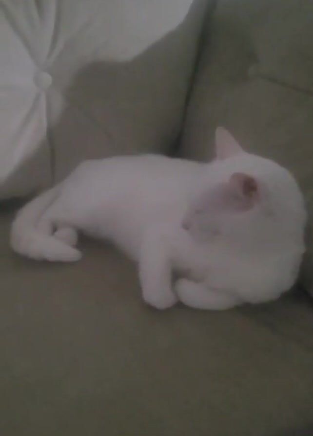 A video shows a white cat curled up and sleeping on a light brown couch