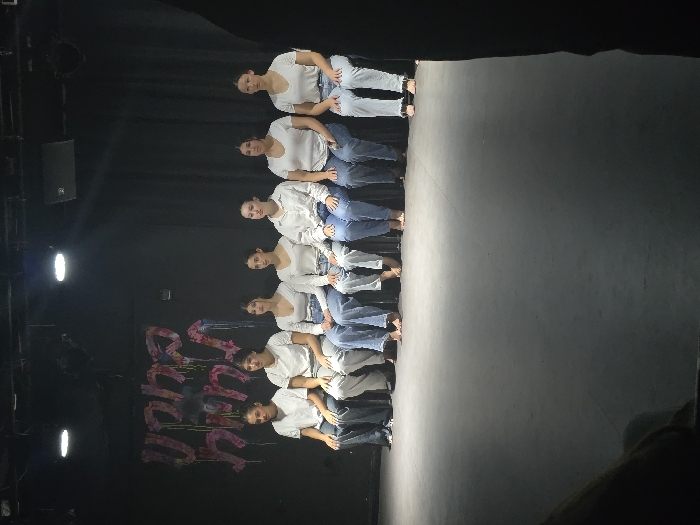 Seven individuals are lined up on a stage, dressed in white tops and denim jeans. They are seated in a row, facing the audience. Behind them, a black curtain serves as a backdrop. To the left, pink and grey artwork is visible on the curtain. The stage floor is light grey. A lighting fixture illuminates the scene from above.