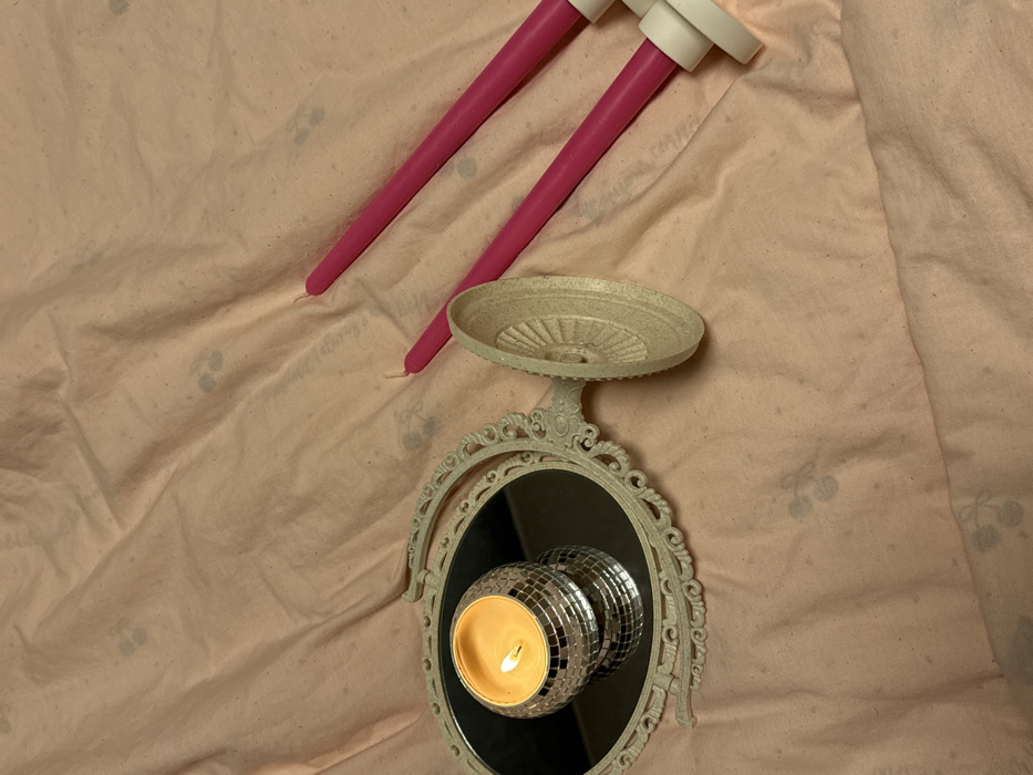 Two pink candles with white bases lie on a wrinkled pink fabric adorned with faint cherry designs. Below the candles is a candle holder with an ornate, off-white, mirror-backed base. Reflected in the mirror is a lit disco ball candle, adding a sparkling effect to the scene.