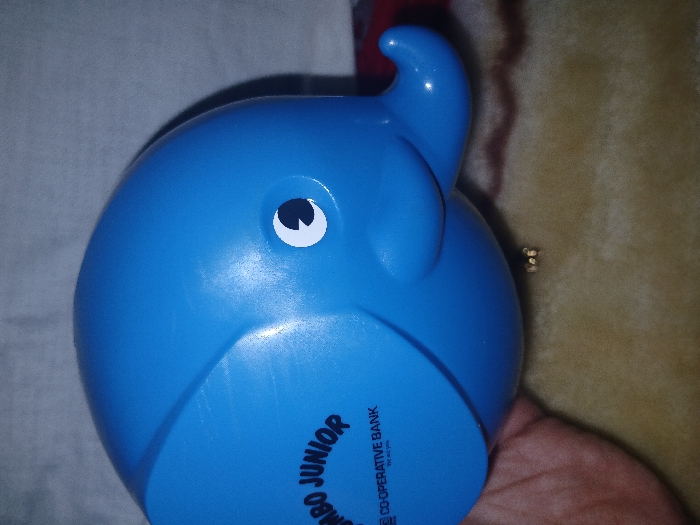 A blue, whale-shaped piggy bank is displayed. The toy has a cartoonish design, including a single, prominent eye with a white outline. The bank is labeled "BOMBO JUNIOR" and "CO-OPERATIVE BANK," suggesting it might be promotional merchandise. The image background is somewhat blurred, with a glimpse of what appears to be a hand holding the piggy bank. The overall composition gives a close-up view of the whale's head and part of its body.
