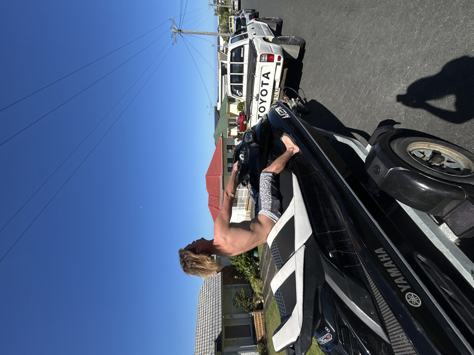 A shirtless man with blond hair sits on a black Yamaha jet ski mounted on a trailer on a street