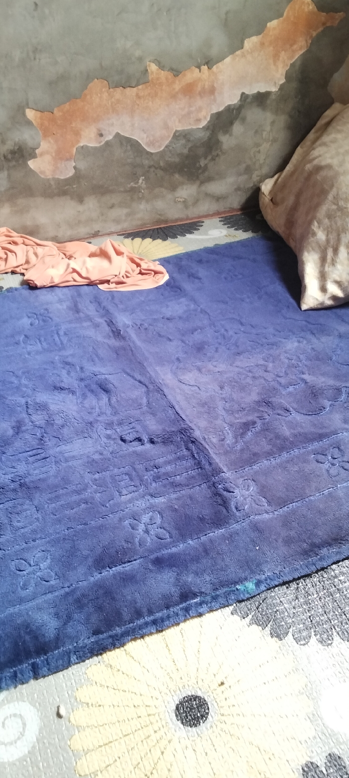The image depicts an interior scene in Unknown, Unknown, focused on a room corner. A grey concrete wall, presenting significant peeling paint that exposes a reddish-brown substrate, forms the background. A crumpled, light beige pillow rests against this wall in the upper right. The floor is largely covered by a dark blue, plush rug featuring embossed floral and geometric patterns. A crumpled light orange fabric object is positioned on the blue rug in the upper left. A patterned floor mat, exhibiting large yellow and grey floral designs, is visible beneath the blue rug at the bottom of the frame. No people, actions, or interactions are present in the scene.
