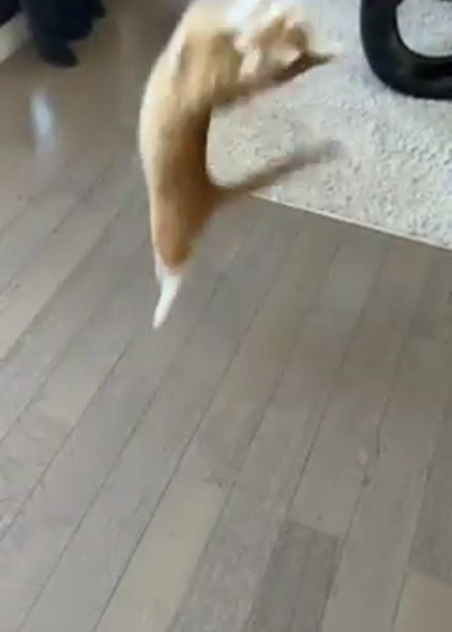 person playing with a ginger and white cat. The cat is sitting on a wooden floor in a living room, near a white rug and a black coffee table. The person, wearing a white shirt, waves a blue and clear object in front of the cat. The cat gets up and follows the object, sometimes jumping. The person continues to move the object, causing the cat to chase it around the room.