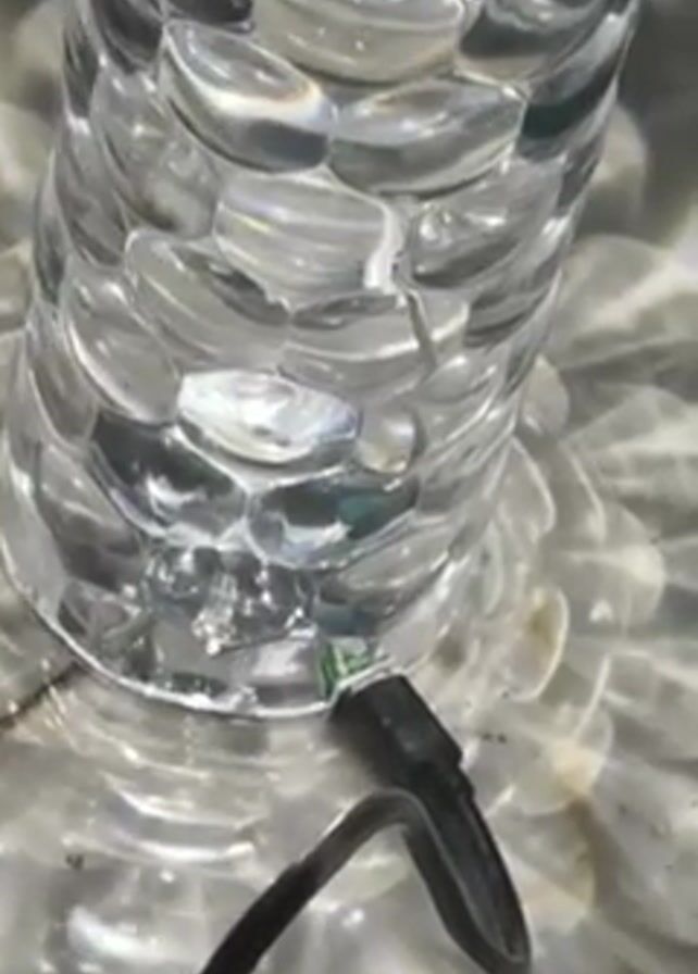 base of a cylindrical glass lamp. The lamp is constructed from clear, rounded glass elements that are stacked to form its body. A black USB cable is connected to the base of the lamp. The lamp rests on a white, slightly reflective surface which creates soft, flower-like light patterns around it. The camera is positioned close to the lamp, providing a detailed view of its construction and the cable connection.