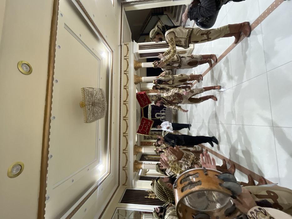 The image captures an indoor scene within a large, ornate hall located in Babella, Syria. The hall features a high, light-colored ceiling equipped with multiple recessed lights and a prominent multi-tiered crystal chandelier. The walls are embellished with gold-colored trim, decorative molding, and classical columns topped with gold-colored capitals. The floor consists of light-colored tiles accented by a darker linear pattern running down the center. Approximately ten to twelve individuals are present. A central group of at least eight men is engaged in what appears to be a traditional performance, characterized by dancing and musical elements. They are uniformly dressed in light beige or tan outfits adorned with intricate gold or dark embroidery, long sleeves, and knee-high brown boots. Most also wear patterned head coverings. Specific actions include several men clapping their hands, some with arms raised, and one man in the foreground on the left playing a large, round frame drum with cymbals. Another man in the center foreground is actively dancing with bent knees. Two additional men are observing the performance. One individual in a black long-sleeved shirt and black pants stands among the performers, with his hands clasped. Another individual, wearing a white collared shirt and dark pants, is positioned further back in the central area. The background features an elaborate focal point consisting of an ornate, high-backed white sofa or throne, set against dark purple drapes. Above this area, two rectangular red banners displaying white Arabic script are suspended. A staircase with a dark railing is visible on the right side of the background, and a reflective surface or mirror is present on the left wall.